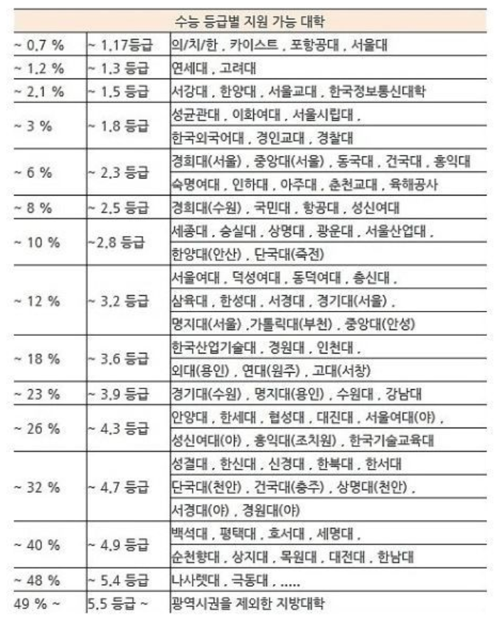 수능 성적을 받은 지금은 본인의 등급을 알 수 있을 것입니다. 이 등급에 따라 지원, 진학이 가능한 대학을 가늠할 수 있게 되는데 등급별로 어떤 대학들이 있는지 먼저 살펴 보겠습니다.