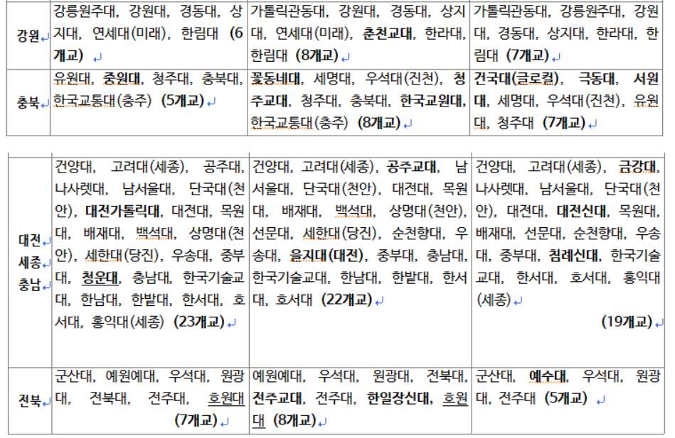 경희대, 중앙대, 건국대, 동국대, 홍익대, 숙명여대, 국민대, 세종대, 인하대, 단국대, 항공대, 성신여대, 항공대, 숭실대, 상명대, 광운대, 부산대, 경북대 등