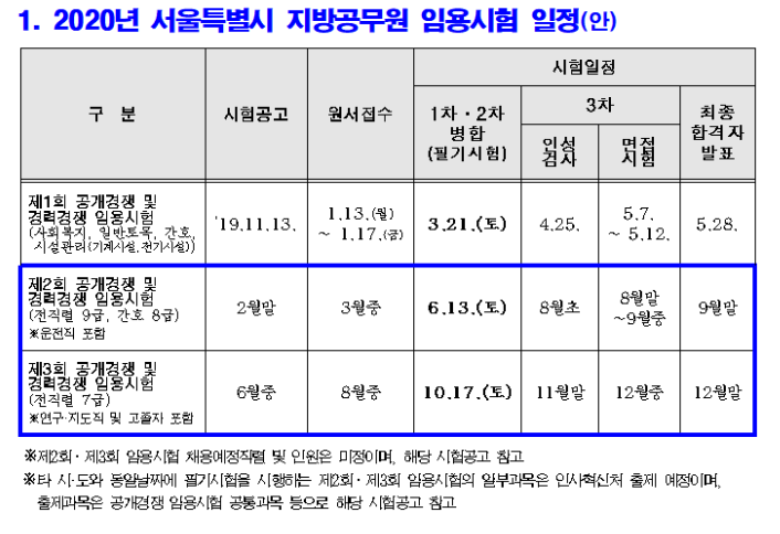 다른 2,3회차 시험의 원서접수 일정 등 시험 공고는 2월말, 6월중에 있을 것으로 공지되었습니다. 서울시 지방직 공무원 시험 일정은 http://gosi.seoul.go.kr/ 에서 확인 가능합니다.