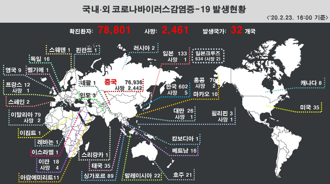 31번 확진자가 다녔던 신천지 교단으로부터 급속도로 확산되기 시작한 코로나19는 20일을 기점으로 확 올라가기 시작하더니 23일 현재 확진자가 602명으로 중국과 일본크루즈를 제외하고 세계에서 3번째로 많은 숫자를 기록하고 있습니다. 문제는 일본 크루즈 634명과 별 차이가 없어 곧 중국 다음으로 많은 곳으로 올라설 전망이라 매우 암울합니다. 23일 하루에만 어제와 비교하여 169명이나 추가된 것인데 이런 속도라면 1천명대로 올라가는 것도 시간 문제일 것 같습니다. 확진자 가운데 대구, 경북 지역이 압도적으로 많은 495명으로 거의 500명에 육박하고 있습니다. 주범으로 지목되고 있는 신천지 대구 교단에서만 확진자가 329명에 이르고 있어 가히 신천지 코로나로 불러도 전혀 이상하지 않은 상황입니다. 사망자수는 현재 5명에 이르고 있어 중국, 이란의 뒤를 잇고 있습니다. 문제는 현재 검사를 진행하고 있는 사람의 숫자가 8천57명에 이르고 있다는 것인데 익일에는 700명대를 넘어설 것으로 관측되고 있습니다.