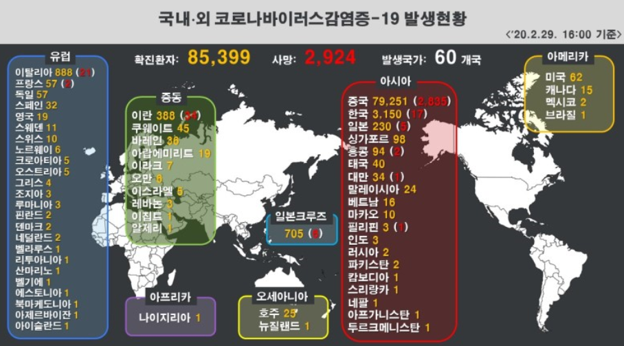 2월 마지막 날 현재 확진자 현황을 살펴 보면 전 세계적으로 85,399명의 확진자가 있으며 이중 사망자는 2,924명으로 현재 사망률은 3.42%에 이르고 있습니다. 발생국은 61개국에 달하고 있는데 우리나라의 확진자가 급증하고 있어 우려가 큰 상황입니다. 29일 오늘만 해도 중국은 전일 대비 427명 증가에 비하여 우리 나라는 무려 813명이 증가하며 3,150명에 달하고 있습니다. 물론 신천지 교인들을 전수 조사하는 과정에서 나오고 있으며 대구, 경북 지역의 확진자가 거의 다이지만 다른 지역도 함께 증가하고 있는 상황입니다. 확진자수 대비 사망률을 상위 4개 국가로 국한하여 보면 가장 사망률이 높은 나라는 이란으로 388명 확진에 34명 사망으로 8.76%이며 그 다음으로 중국이 2,835명 사망 3.58%, 이탈리아가 21명 사망으로 2.36%에 이르고 있습니다. 대한민국의 사망률은 17명 사망 0.54%로 아직까지는 낮은 수치인 것이 그나마 다행입니다.