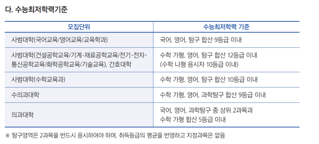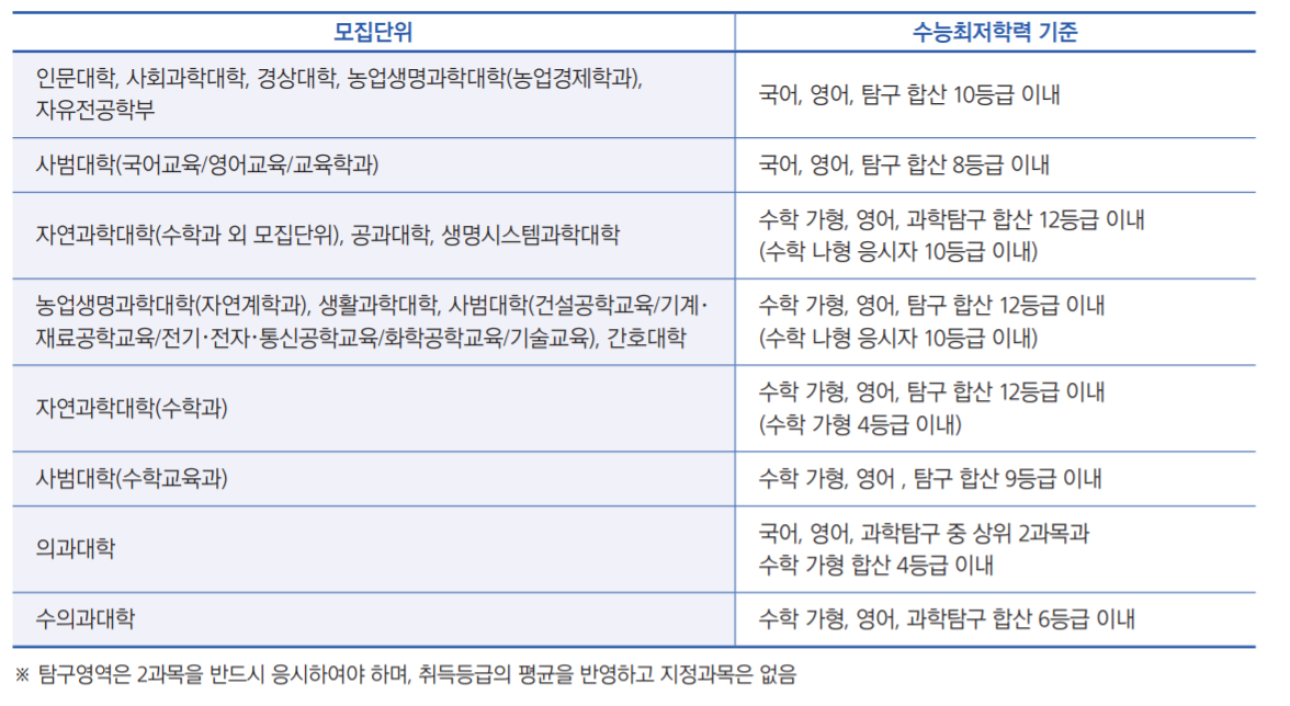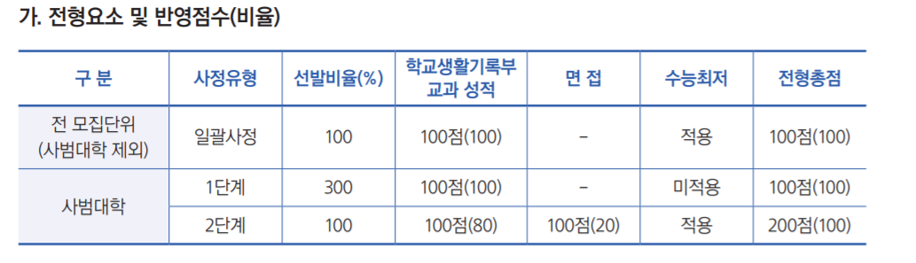 학생부 교과는 총 1,668명을 선발하며 이 중 일반 학생부 교과 전형으로 1.064명을 뽑습니다. 지역인재전형은 493명입니다. 학생부교과 성적 100% 반영입니다. 양대 전형은 수능최저학력기준이 있습니다. 모집단위 별로 차이가 있으니 지원 학과 별로 잘 확인해야 하겠습니다. 인문대는 국어, 영어, 탐구 3과목 합 10이내로 3/3/4 등급만 얻어도 수능 최적기준은 충족시킬 수 있습니다. 사범대는 국어, 영어, 탐구 합산 8이내입니다. 자연과학대학은 수학가형, 영어, 과탐 12등급이내, 수학나형을 선택할 경우 10등급 이내입니다. 사범대는 자기소개서도 제출해야 하며 1단계 선발, 2단계 면접 20%, 학생부교과 80% 전형을 통과해야 합니다.