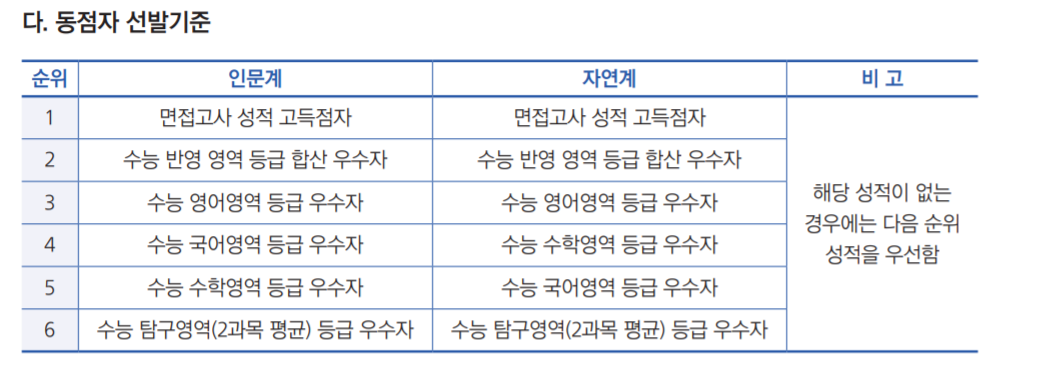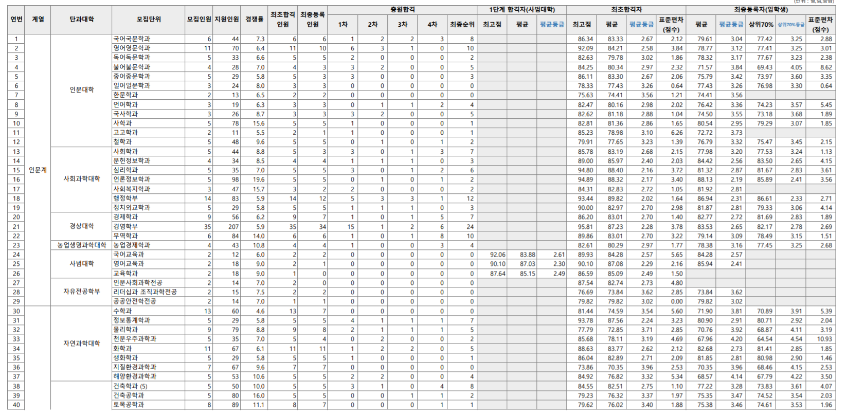 학생부 종합은 종합적인 서류 평가 영역이니 교과는 절대적이지는 않으며 다소 등급은 낮은 편입니다. 그러나 1단계에서 교과 성적은 절대 무시할 수 없는 기준이기도 합니다. 인문계의 경우 2등급 후반~3등급 중후반대 성적을 기록했으며 자연계는 의대, 수의대를 제외하면 3~4등급 입결을 보여주고 있습니다. 참고 자료로만 활용하시기 바랍니다.