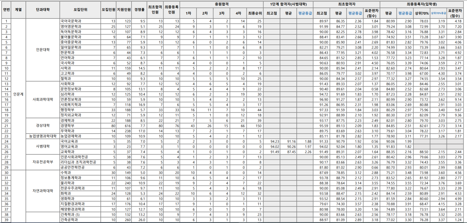 학생부교과 수시등급을 알아보겠습니다. 평균 등급 기준 인문계 인문대학은 2.74~3.98, 사회과학대학 2.28~2.97, 경상대학 2.51~3.04, 사범대1.82~2.16등급이었습니다. 자연과학대학은 2.59~3.91, 공과대학 2.05~4.15, 농업생명과학대학 2.52~3.96, 의예과 1.17, 수의예 1.56, 간호대학 2.03등이었습니다. 인문계는 2등급 중반~3등급 초반대 안정권, 자연계는 2등급 중후반~3등급 중반대로 보입니다. 기계, 전기, 전자 공학 등 주요 공과대 등급은 2등급 이내입니다.