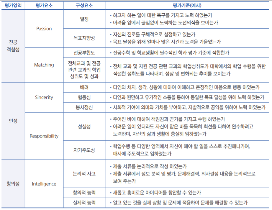 학생부 종합 중 학생부 종합 I PRISM 인재 전형은 481명, 학생부 종합 II 농어촌 학생은 108을 선발합니다. 전체로는 781명을 학생부 종합 전형으로 선발합니다. 학생부 종합 전형은 1단계 서류 100%, 2단계 서류66.7, 면접 33.3% 비중으로 면접 비율이 다소 높은 편입니다. 자기 소개서 제출은 필수입니다. 수능최저학력기준은 없으나 PRISM 인재는 의대, 수의대, 간호대, 사범대는 수능최저학력기준이 있으니 수능 준비에도 소홀히 하면 안되겠습니다. 학생부 종합 평가 기준은 전공적합성, 인성, 창의성입니다.