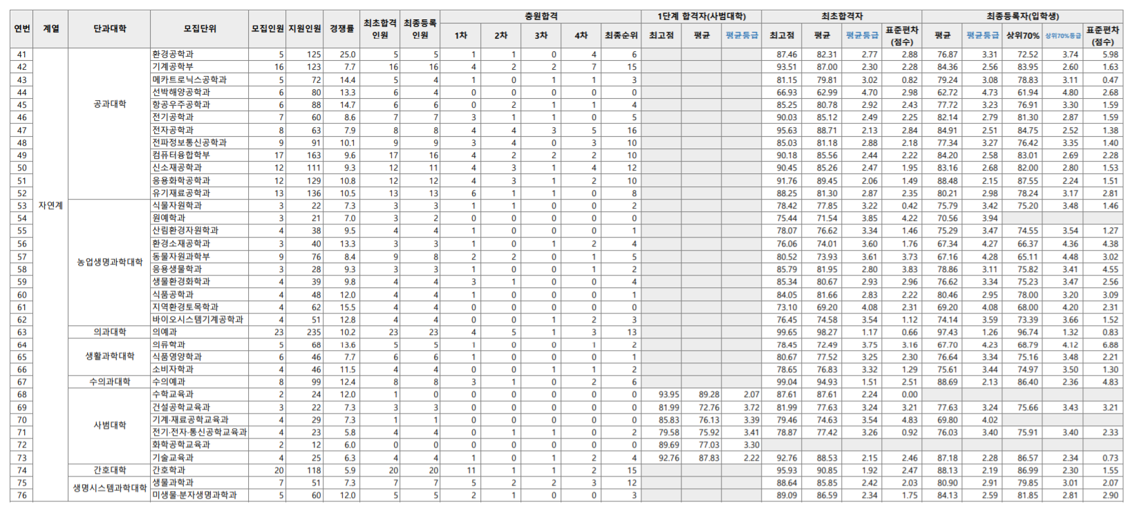 충남대 수시등급, 입시결과
