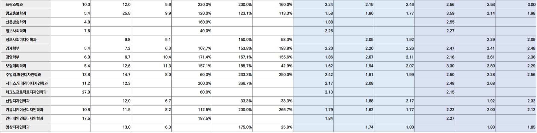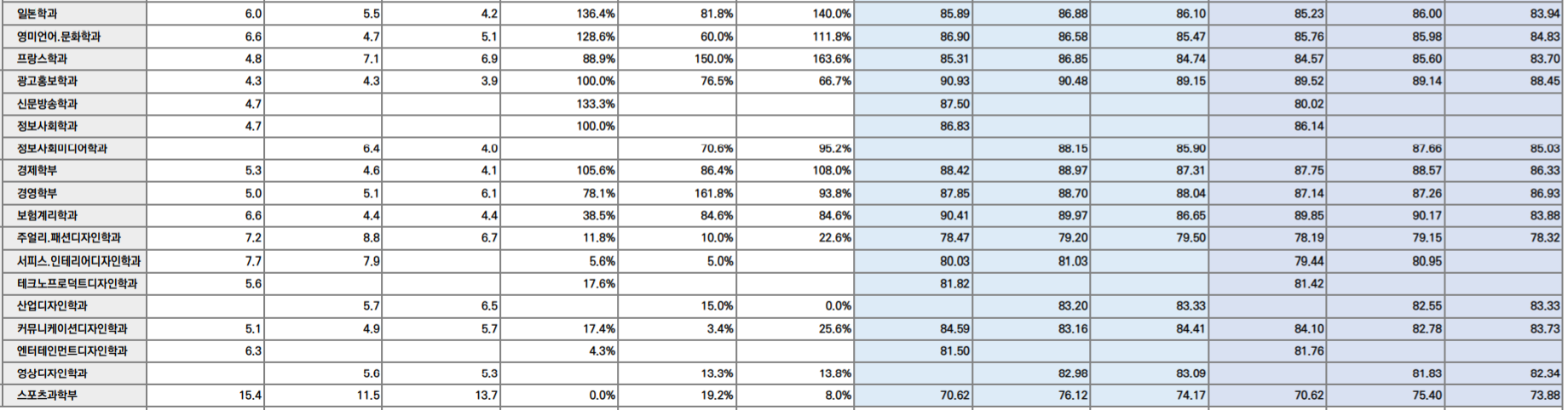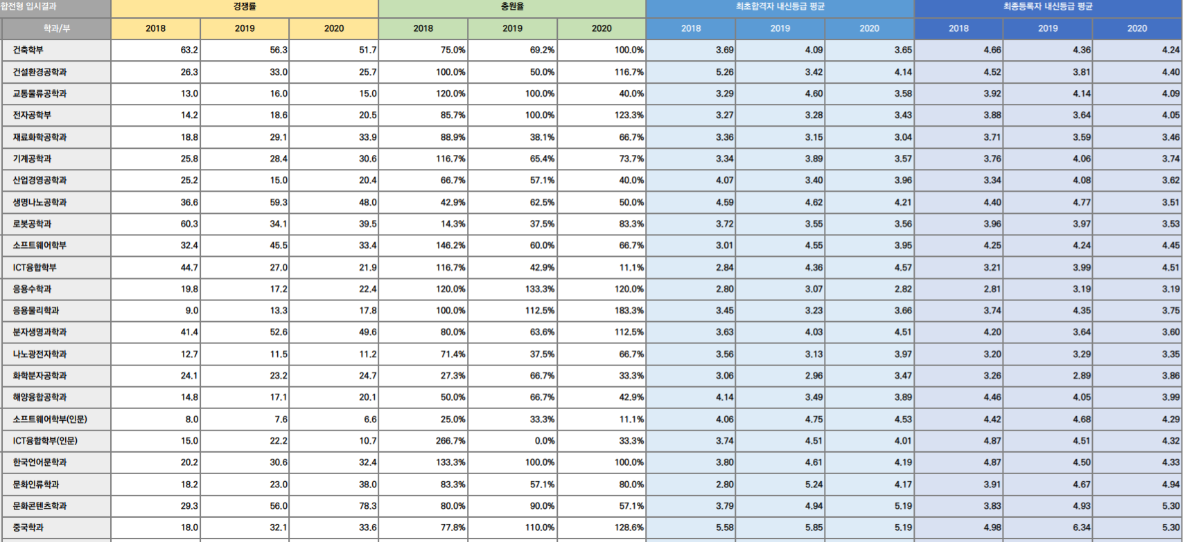 학생부 종합의 교과 성적은 정성 평가이므로 등급은 참고하시면 되겠습니다. 자연계는 3등급 중반~4등급 중반, 인문계는 4등급 초반~5등급 중반까지입니다. 몇몇 학과를 보면 건축 4.24, 로봇공학 3.53, ICT융합 4.51, 응용수학 3.19, 나노광전자 3.35, 한국언어문학 4.33, 일본학 5.42, 광고홍보 4.25, 경제 4.52, 경영 4.18입니다.