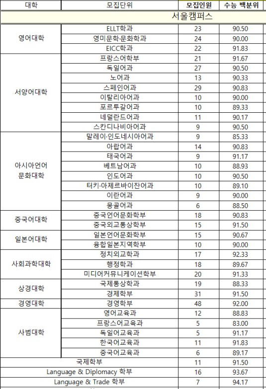 한국외국어대, 서울시립대 수능 정시등급, 백분위컷