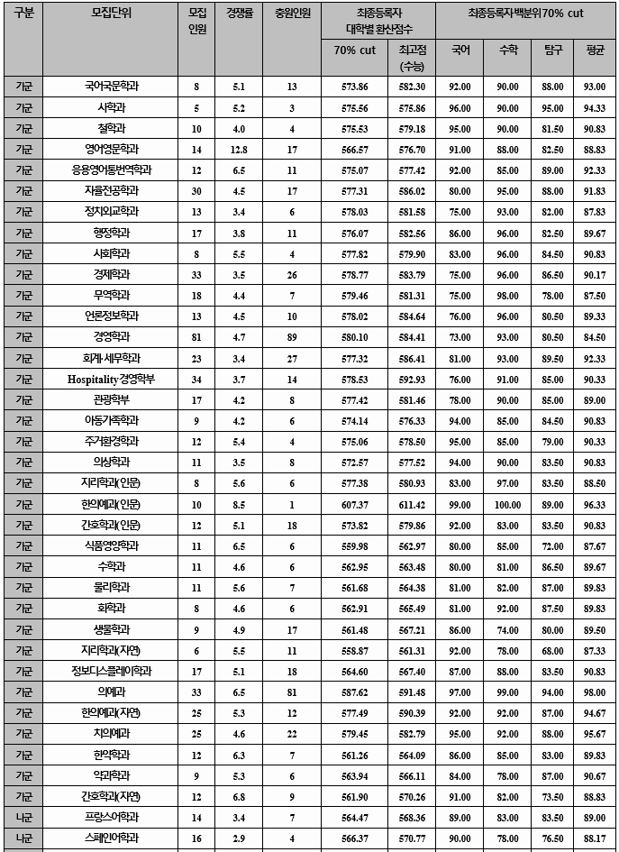 중앙대, 경희대 수능 정시등급, 백분위컷