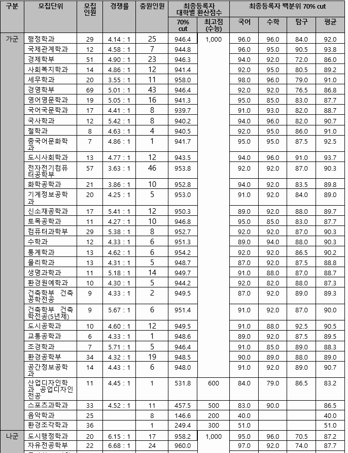 중앙대는 국어, 수학 과목은 표준 점수를 활용하며 탐구 과목은 백분위를 활용한 변환표준점수를 사용합니다. 절대 평가인 영어와 한국사는 등급을 활용한 환산 점수입니다. 정시 수능 일반은 가나다군으로 모집단위를 구분하여 모집하니 지원 희망 학과의 모집군을 잘 살펴봐야 하겠습니다. 2020년도 기준으로 볼 때 합격자의 국어, 수학, 탐구 과목 백분위 70%컷을 보면 인문대학 92.83, 의학부 98.23, 영어교육 92.53, 공과대학 91.50, 사회과학대학 92.83, 경영경제 93.50, 간호학과(자연) 90.33이었습니다.