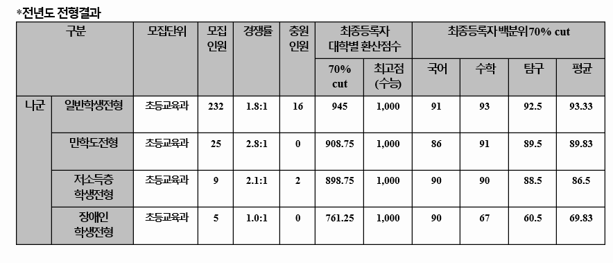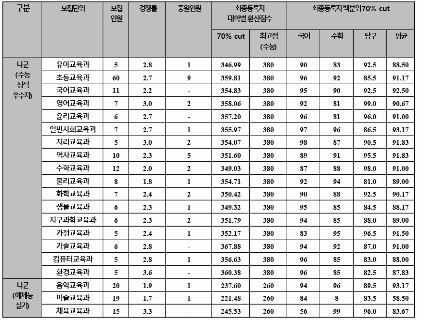 탐구 과목은 2과목이며 수능 반영지표는 백분위입니다. 수학가형 선택시 3%의 가산점이 있습니다. 지원 예상 백분위 점수는 초등교육 여학생 280, 여학생 281점으로 예상됩니다. 2020학년도 합격생 70% 표준 백분위 점수는 93.33점입니다.