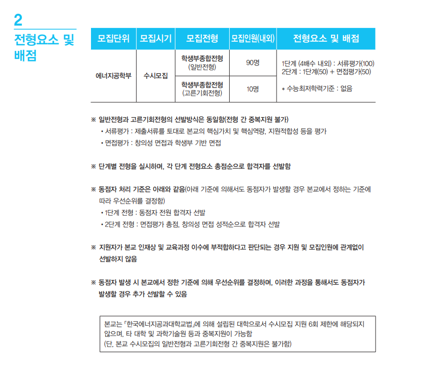 한국에너지공대는 2022학년도 신입생 선발을 위한 모집 요강을 발표하였습니다. 모집 단위는 에너지공학부 단일입니다. 모집 요강에 따르면 신입생 선발 인원은 정원외 포함하여 110명입니다. 수시모집이 대부분으로 학생부 종합전형으로 90명, 학종 고른기회 정원외 10명, 정시모집 수능우수자 전형으로 10명을 선발할 계획입니다. 지역 소재 학생을 위한 별도 전형은 없습니다. 수시모집 6회 제한에 해당되지 않으므로 중복 지원도 가능합니다.