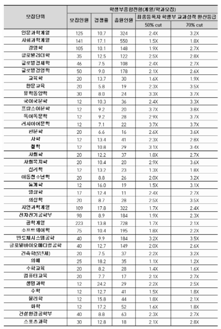 2021학년도에는 학생부 종합 1차, 2차로 구분하여 신입생을 선발하였으며 올해는 변화가 있으니 교과 성적 수시 등급은 참고자료로만 보면 되겠습니다. 최종 등록자 70%컷 기준으로 학생부 종합 1차에서는 신문방송학과가 1.5등급대로 가장 높은 등급대였습니다. 국어국문학 3.1, 사회학 3.4, 심리학 1.9, 물리학 4.5, 생명과학 2.2, 화공생명공학 2.6, 기계공학 2.8등급입니다.