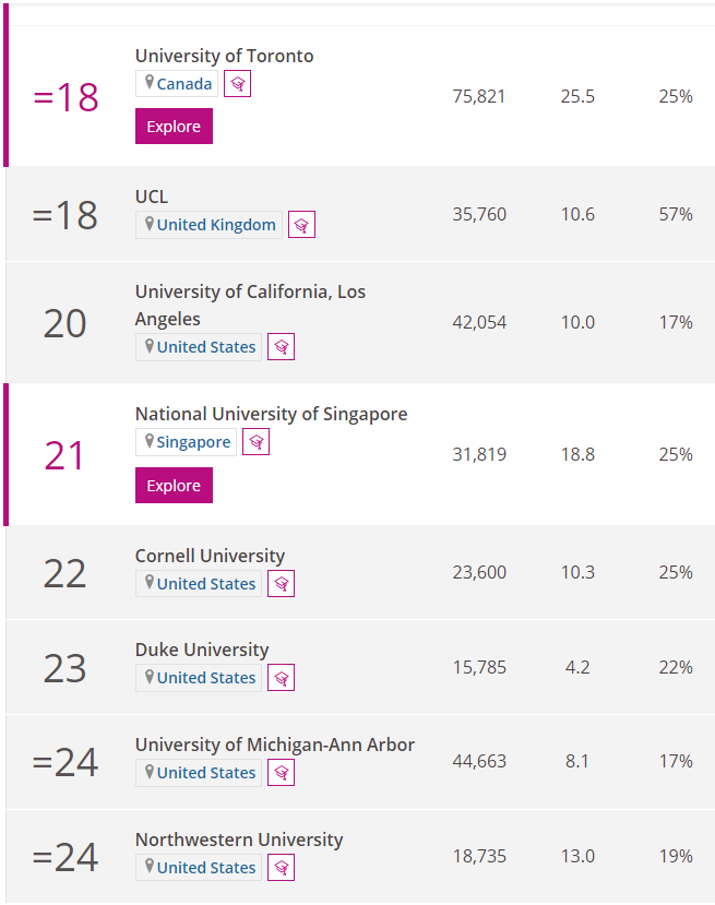 THE 세계 대학 순위를 보면 1위는 옥스포드, 2위 캘리포니아공과대학(미국), 하버드대(미국), 4위 스탠퍼드대, 5위 케임브리지대(영국),MIT(매사추세츠 공과대학), 7위 프린스턴 대, 8위 캘리포니아 대(버클리캠퍼스), 9위 예일대, 10위 시카고 대학 순입니다. 옥스포드와 케임브리지를 제외하면 모두 미국 대학입니다. 아시아 권 대학으로는 중국의 베이징 대학과 칭화대학이 함께 16위를 기록하며 가장 높은 순위입니다. 다음으로 싱가포르 국립대학(21위), 홍콩대학(30위), 일본 도쿄대학(35위) 순입니다. 유럽 스위스의 취리히 연방공과대학교(15위), 캐나다 토론토 대학(18위)도 순위가 높은 대학입니다.