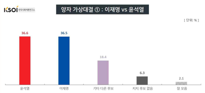 이재명 후보와의 양자대결에서는 홍준표, 윤석열 두 후보가 모두 접전을 벌이는 것으로 나타나고 있습니다. 이재명 VS 홍준표 후보는 35.2, 34.2, 이재명 VS 윤석열 36.5, 36.6으로 오차 범위내 접전입니다. 후보가 결정되고 나면 본격적인 양자 대결 여론조사가 이어질 것으로 보이는데 귀추가 주목됩니다. 여론조사 관련 보다 자세한 내용은 중앙선거여론조사심의위원회나 한국사회여론연구소 홈페이지를 참조하면 됩니다.