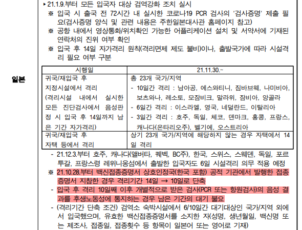 한국사람들이 많이 방문했던 프랑스는 12월 4일 출발 기준으로 한국 출발 승객들은 백신 접종 여부와 무관하게 출발 48시간 이내 COVID-19 음성확인서 소지가 의무 시행되었습니다. 필리핀은 12월 3일부터 입국하는 모든 한국 출발 승객들은 72시간 이내 COVID-19 PCR 음성확인서 소지 의무 시행입니다. 일본은 모든 외국인에 대한 입국을 금지하고 있으며 72시간 이내 PCR음성확인서를 소지한 일본국적자, 특별영주자, 재류자격 보유자만 입국이 허용됩니다. 한국 출발 승객들은 일본 입국시 6일 시설 격리, 8일 자가 격리 등 총 14일 격리를 해야 합니다. 싱가포르는 한국과 체결한 VTL, Vaccinated Travel Lane에 따라 관광, 상용 목적의 입국이 허용되고 있으나 30,000 싱가포르 달러 이상 보장하는 여행자 보험에 가입해야 하며 백신 접종 완료 14일이 경과한 증명서, 항공편 탑승 2일 이내 검사한 영문 PCR 또는 Antigen 음성 확인서가 필요합니다. 싱가포르 창이 공항에 입국 직후 PCR 검사를 실시하며 개인 교통수단 또는 택시를 이용하여 지정 숙소로 이동하고 24시간 소요되는 음성확인 결과 접수때까지 단독 격리해야 합니다. 추가적으로 12월 3일부터는 도착 3일, 7일차 지정된 클리닉에서 Antigen 검사가 실시됩니다.