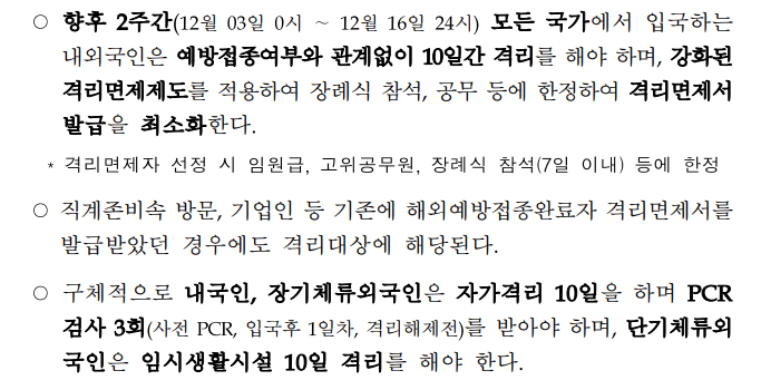 여기에는 오미크론 바이러스 관련 위험국가를 추가하는 것과 모든 해외국가에서 출발하여 한국으로 입국하는 사람들에 대하여 10일간 격리를 시행하는 내용이 포함되었습니다. 내용을 보면 향후 2주간(12월 03일 0시 ∼ 12월 16일 24시)모든 국가에서 입국하는 내,외국인은 예방접종여부와 관계없이 10일간 격리를 해야 한다고 발표되었습니다. 또한 강화된 격리면제제도를 적용하여 장례식 참석, 공무 등에 한정하여 격리면제서 발급을 최소화하기로 했습니다. 지금까지는 백신 접종이 완료되었으면 자가 격리는 면제되었으며 PCR 검사만 받도록 했으나 이제는 예외없이 격리를 시행하기로 한 것입니다. 오미크론 변이 바이러스 확진을 받은 나이리지아 여행객들도 백신 접종 완료자들이었던 것도 감안된 것으로 보입니다. 긴급 조치에 따라 내국인, 장기체류 외국인은 자가격리 10일을 하며 PCR 검사 3회(사전 PCR, 입국후 1일차, 격리해제전)를 받아야 하며, 단기체류 외국인은 임시생활시설 10일 격리를 하도록 변경되었습니다.