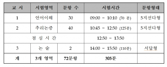 리트 시험은 기본 취지가 법학교육을 이수하기 위한 기본 능력과 소양이 있는지를 측정하기 위한 시험으로 종합적인 사고 능력이 필요하며 반드시 법학을 전공해야 하는 것은 아닙니다. 시험 과목으로는 언어 이해로 독해능력과 의사소통 능력, 사고력 측정, 추리논증 영역에서는 추리와 논증 능력 측정, 논증적 글쓰기 능력을 평가하는 논술 영역 등 세가지로 구성되어 있습니다. 논술은 서술형이며 나머지 두과목은 5지선다형입니다.
