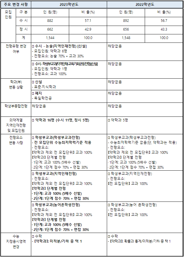 학생부 교과 전형은 교과성적(내신) 100%반영이며 역시 수능최저학력기준을 적용합니다. 지난 2022년 전형과 달리 전 모집단위 적용을 하는 점이 달라졌습니다. 학생부 반영 과목은, 인문/체능계열은 국어, 영어, 수학, 사회, 한국사 교과군에 해당하는 1, 2, 3학년 전 과목, 자연계열은 국어, 영어, 수학, 과학 교과에 해당하는 1, 2, 3학년 전 과목이며, 학년별 가중치는 없습니다. 고려대 세종캠퍼스는 학생부 종합 전형은 없습니다.