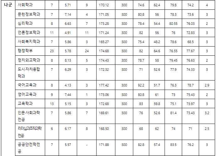 정시배치표 참고 점수입니다. 인문계 가군 경영 368, 경영 366, 무역 364, 사학과 362, 국어국문 360, 언어 359, 국사 357, 한문 356, 나군 국어교육과, 행정 368, 언론정보 366, 영어교육 366, 정치외교 363, 사회복지 362, 문헌정보 360, 자연계 가군 의예 408, 수의예 397, 간호 359, 생화학 358, 화학 356, 식품공학 351, 응용생물 350, 수학 349, 천문우주과학과 344, 물리 343, 생물환경화학과 335, 바이오시스템기계공학과 330, 나군 약학 395, 수학교육과 372, 전자공학과 361, 기계공학부 358, 미생물분자생명과학과 355, 생명정보융합학과, 신소재공학과 351, 건축학과, 항공우주공학과 350, 전파정보통신공학과, 환경공학과 347, 스마트시티건축공학과 345, 의류학과 344, 자율운항시스템공학과 341, 전기전자통신공학교육과 337점으로 예상합니다.