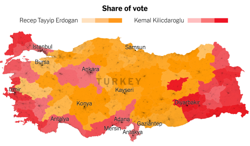 이번 선거는 지난 2018년에 이어 5년만에 치러진 대통령 선거였습니다. 여러 후보가 난립한 끝에 집권당인 ‘정의개발당(AKP)’을 중심으로 4개 정당 연합 후보로 나선 레제프 타이이프 에르도안 대통령과 ‘공화인민당(CHP)’ 등 6개 야당 연합이 내세운 케말 클르츠다로을루 후보 간 양강 구도로 선거전이 이어졌습니다. 튀르키예는 대선 1차 투표에서 50% 이상 득표한 후보가 나오지 않을 경우 상위 1, 2위 후보가 결선투표에 진출해 최종 승자를 정하게 되어 있습니다. 그의 라이벌인 세속 야당 지도자인 케말 킬릭다로글루는 44.9%를 얻었습니다. 치열한 선거전이 치러지면서 유권자가 양쪽으로 분열되었습니다. 두 진영간의 격차는 불과 단 4%의 차이만 있었습니다.