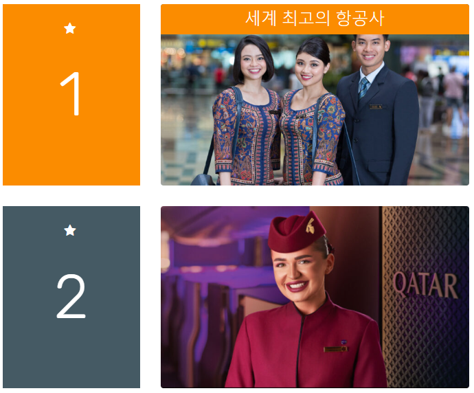 1위는 싱가프로 항공이 차지했습니다. 싱가포르항공(SQ)는 전통적으로 세계적인 평가에서 좋은 결과를 받고 있는 항공사입니다. 스타얼라이언스에 속해있으며 한국에도 취항하고 있습니다. 5성급 항공사로 서비스에 대한 투자가 많이 이루어지고 있는 항공사로 잘 알려져 있습니다. 2위는 2022년 1위였던 카타르 항공(QR)이 차지했습니다. 여전히 높은 순위입니다. 카타르항공은 원월드에 속해 있으며 1993년 설립된 카타르 국영 항공사입니다. 허브 공항은 도하 국제공항입니다. 한국에도 인천/도하 구간을 운항중입니다. 3위는 ANA 전일본공수(NH)입니다. 2022년보다 한단계 상승했습니다. 현재 일본 항공사 순위 1위이기도 합니다. 역시 서비스에 큰 비중을 두고 있는 항공사로 매년 좋은 평가를 받고 있습니다.