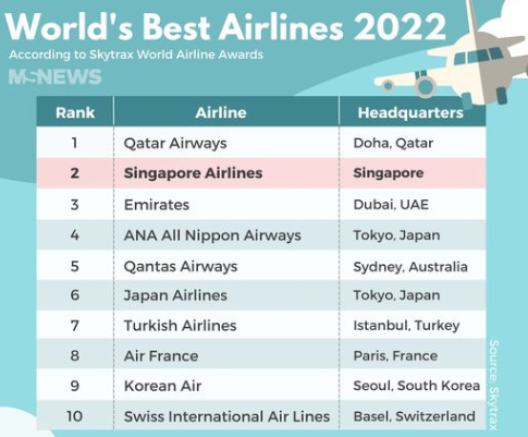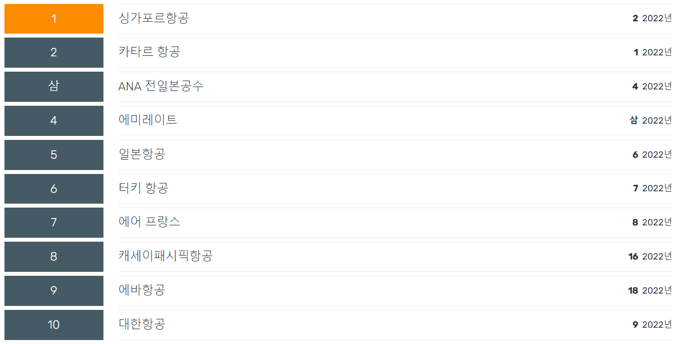 스카이트랙스 선정 2022년 세계 톱10 항공사 순위