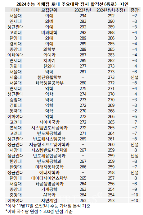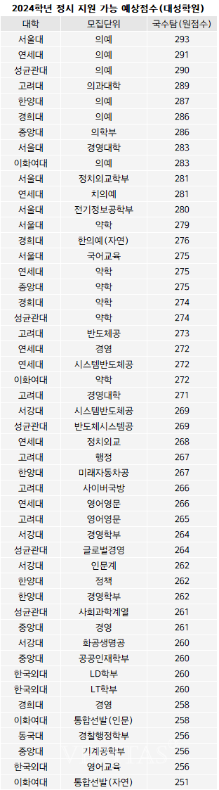 주요 입시기관에서는 수험생들의 가채점 결과를 기반으로 2024 수능 정시참고배치표를 발표했습니다. 원점수 기준으로 서울대 의예과의 경우 293점으로 예상하는 등 주요 대학, 학과의 예상 점수대가 제시되었습니다. 입시기관 대성학원에서 발표한 자료를 인용하여 확인해 보도록 하겠습니다.