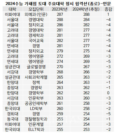 인문계열에서는 서울대 경영대학이 283점으로 가장 높을 것 같습니다. 대체로 입결이 높은 경영, 경제학과만 볼때 연세대 경영 272, 고려대 경영대학 271, 서강대 경영학부 264, 성균관대 글로벌경영 264, 중앙대 경영 261, 경희대 경영 258점으로 예상합니다. 주요대학, 학과로 보면 서울대는 정치외교학부 281점, 전기정보공학부 280, 국어교육 275, 연세대 시스템반도체공학 272, 정치외교 268, 영어영문 266, 고려대 반도체공학 273, 행정 267, 사이버국방 266, 영어영문 265점으로 예상합니다. 다음으로 서강대 시스템반도체공학 269, 인문계 262, 화공생명공학 260, 성균관대 반도체시스템공학 269, 사회과학계열 261, 한양대 미래자동차공학 267점, 정책, 경영학부 262, 중앙대 공공인재 260, 기계공학부 256, 한국외대 LD학부 260, LT학부 260, 영어교육 256, 이화여대 통합선발(인문) 258, 통합선발(자연) 251, 동국대 경찰행정 256점으로 예측됩니다.