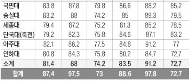 수능 2등급대에서는 SKY 제외 주요대학 10개대 일부 학과도 포함되며, 서울시립대, 건국대, 동국대, 홍익대, 숙명여대는 백분위 평균 87.2점, 국민대, 숭실대, 세종대, 단국대, 아주대, 인하대는 평균 82.5입니다. 한양대 에리카, 한국외대(글로벌), 가천대, 가톨릭대, 항공대, 광운대, 명지대, 상명대, 서울과학기술대, 성신여대, 동덕여대, 덕성여대, 주요 지거국(부산대, 경북대, 전남대)는 모집단위에 따라 2~3등급대에 걸쳐 있습니다. 경기대, 인천대, 을지대는 3등급, 서경대, 삼육대, 한성대는 수능 4등급대입니다.