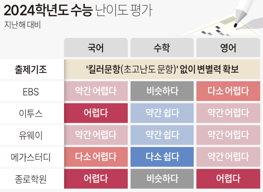 2024학년도 입시를 위한 대입수능시험이 치러졌습니다. 올해에는 킬러 문항 배제 원칙 발표이후 시험이 다소 쉬워질 것이라는 예상이 많았는데 일단 그 예상은 벗어난 것 같습니다. 난이도를 측정하는 객관적 지표인 표준점수 최고점 추정치가 국어 146~148, 수학 146~147점에 이르고 있어 가장 어려운 불수능으로 알려졌던 2022년도 수능과 비슷한 수준으로 어려웠던 것 같습니다.