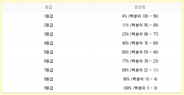 수능 등급은 성적표에 표기된 영역별.선택과목별 표준점수를 1~9등급으로 나눠 나타낸 것을 의미합니다. 표준점수의 상위 4%가 1등급,4~11%가 2등급,11~23%가 3등급,23~40%가 4등급,40~60%가 5등급,60~77%가 6등급,77~89%가 7등급,89~96%가 8등급,96~1백%가 9등급이다. 등급간 경계점에 있는 동점자는 상위 등급으로 기재됩니다.