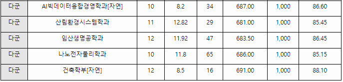 국민대 정시배치표 예상참고 점수입니다. 가군 자동차공학 371, 전자시스템공학 369, 인공지능, 바이오의약 368, 기계금속재료, 바이오발효융합 364, 식품영양 361, 시스템생명공학 359, 식물생명공학 357, 경영, 광고홍보 364, 미디어, 회계 362, 재무금융, 교육 360, 나군 자동차IT융합 372, 미래모빌리티, 소프트웨어 368, 기계공학 362, 지능전자공학 359, 전자화학재료 358, 경제 364, 행정 362, 국제통상 ,사회 361, 일본학 359, 다군 건축(인문) 372, KMU InternationalBusinessSchoo 370, AI빅데이터융합경영 368, 법학 364, 영어영문, 국어국문 363, 글로벌한국어 361, 건축(자연) 370, AI자율주행시스템공 365, 나노전자물리, 산림환경시스템 362점으로 예상합니다.