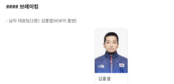 국내 선수 중 유일하게 출전권을 딴 김홍열은 출전하는 타국의 선수들 중 최고령의 나이로 대부분 20대인 경쟁자들과 비교하면 쉽지 않은 경쟁이 될 것입니다. 그는 2022 항저우 아시안게임에서는 은메달을 차지하며 한국의 첫 비보이 메달리스트가 되기도 했습니다. 엄청난 훈련량으로 나이를 극복하는 자세가 매우 돋보이는 선수로 기대가 됩니다. 김홍열은 브레이킹 남자부(B-Boy)에 출전하며, 8월 10일 오후 11시 조별리그를 시작하여, 8월 11일 오전 4시 15분 금메달 결정전을 갖게됩니다.