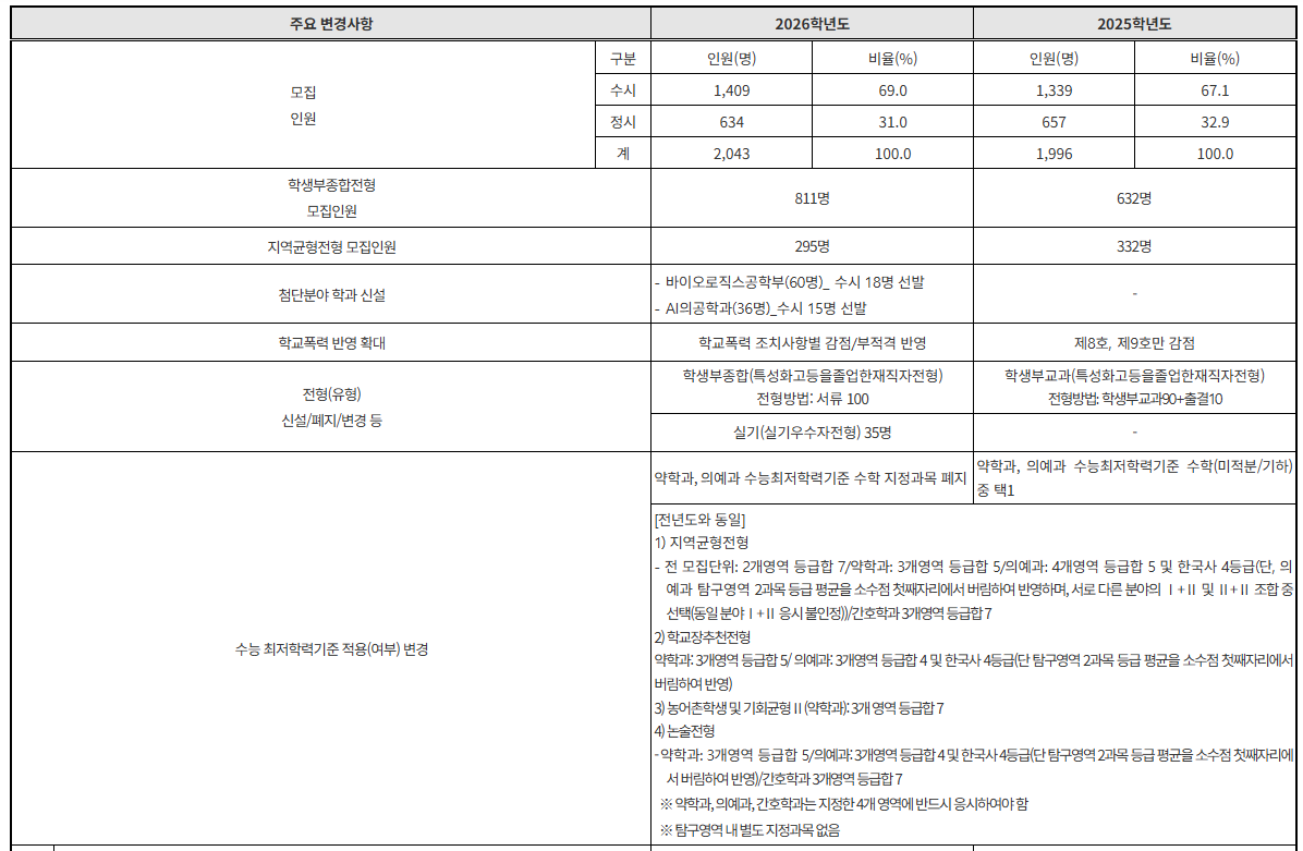 2026 수시모집 요강 정보입니다. 원서접수 일정은 9월 8일(월) ~ 9월 12일(금), 모집인원 총 1,409명 (전체 정원 2,043명 중 수시 선발), 전형별 모집인원 학생부교과 624명, 학생부종합 480명, 논술전형 245명, 실기/특기자 60명이며, 주요 변경사항으로 의약학과 수학 지정과목 폐지, 기회균형 확대, 신설학과 개설이 있습니다. 수능최저 기준은 의예(4합5), 약학(3합5), 간호(3합7) 유지입니다. 원서접수비는 교과 35,00040,000원 / 종합 65,00075,000원 / 논술 65,000원 / 실기 90,000원입니다. 2025 경쟁률·충원율은 교과 평균 경쟁률 6.2:1 / 충원율 110%,종합 평균 경쟁률 8.8:1 / 충원율 90%입니다. 충원율이 낮아 최초합 비중이 큰 특성이 있습니다.