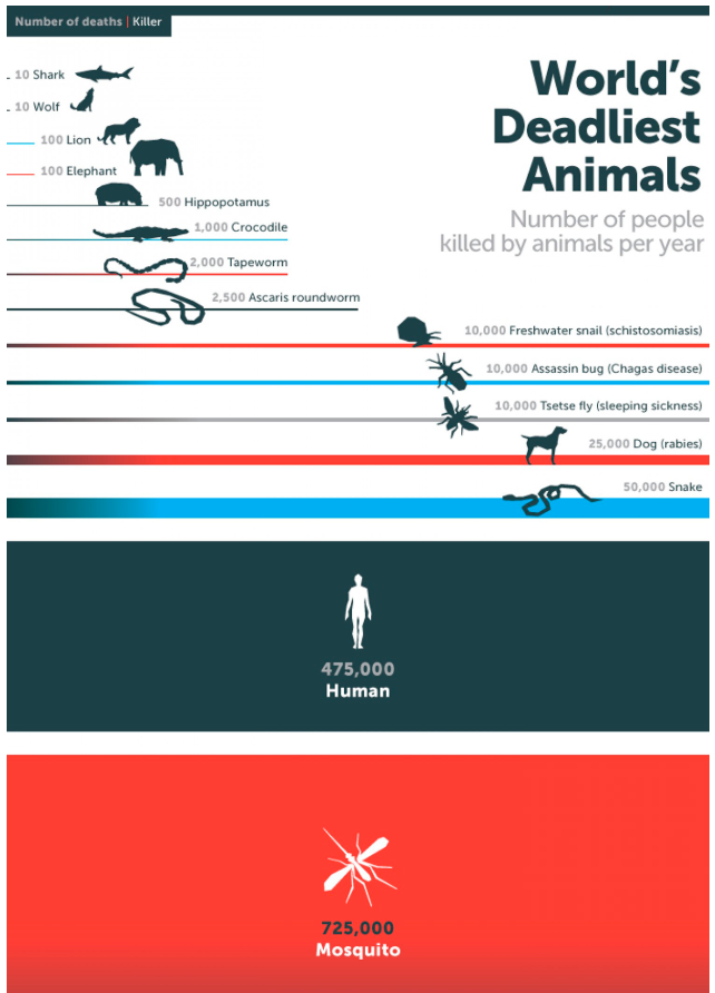 모기는 지구상에 있는 어떤 동물들보다도 사람에게 위험한 동물이기도 합니다. 통계에 따르면 연간 모기에 물려 사망하는 사람의 수가 자그마치 72만여명에 달한다고 합니다. 정확히는 모기에 물리면서 병원균에 감염되어 죽게 되는 것인데 지구에서 인류의 생존을 위협하는 가장 위험한 동물인 것입니다.
