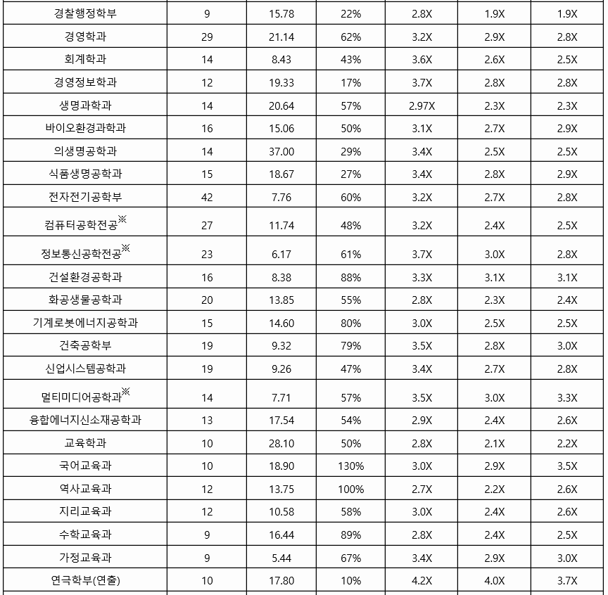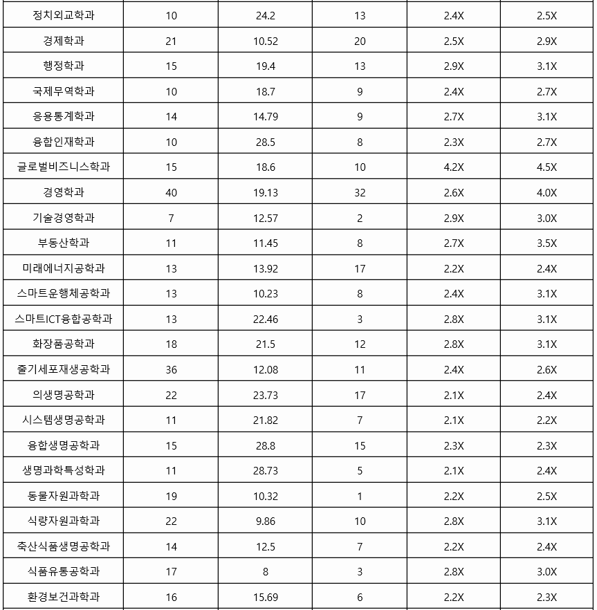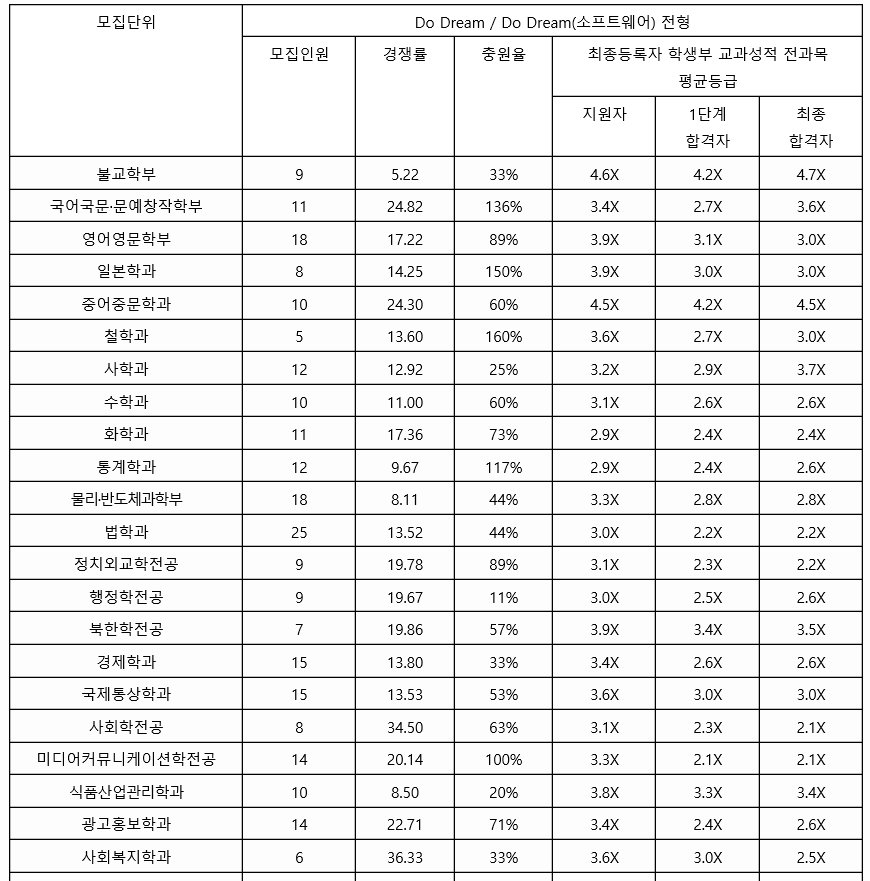 동국대 역시 서류 위주인 학생부 종합 교과 등급 결과를 살펴 보겠습니다. 최종 합격자 기준으로 경찰행정학과 1.9, 교육 2.2, 사회학, 미디어 커뮤니케이션 전공 2.1, 법학, 정치외교 2.2, 의생명공학 2.5, 화공생물공학 2.4, 수학 2.6, 화학 2.4 등입니다. 대부분의 학과가 2등급대에 등급이 형성되어 있습니다.
