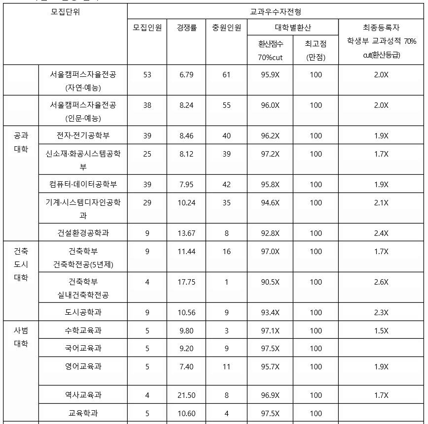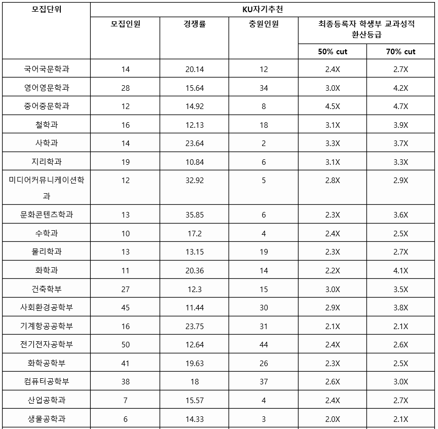 건국대는 2021년도 학생부교과 전형은 없었으며 학생부 종합 교과 등급만 나와 있습니다. KU 자기 추천 전형 일부 학과를 보면 합격자 70%컷 기준으로 국어국문학과 2.7, 철학 3.9, 수학 2.5, 기계항공공학 2.1, 행정 3.1, 글로벌 비즈니스 4.5, 경영 4.0, 부동산 3.5, 의생명공학 2.4, 수의예 1.7, 영어교육 2.2, 식량자원과학 3.1 등입니다. 서류 기반에 의한 결과이므로 교과 성적외 학생부 관리가 중요한 요소입니다. 교과 성적은 참고자료로만 활용하는 것이 좋습니다. 교과 등급은 1~4등급대까지 넓게 분포되어 있는 것이 특징입니다.