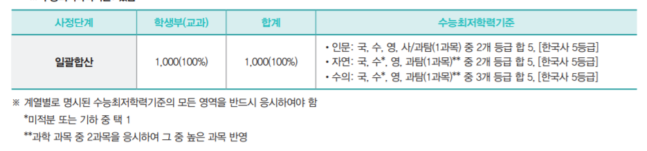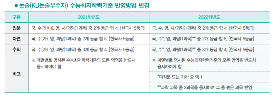 주요 전형으로는 학생부 종합 KU학교추천에서 학생부교과전형으로 변경한 KU지역균형 선발 340명, 학생부종합 KU자기추천 790명, KU논술우수자 435명 등이 있습니다. 학생부 교과 KU지역균형은 학생부 교과 100% 반영이며 수능최저학력기준을 적용합니다. 인문계는 국, 수, 영, 사/과탐(1과목) 중 2개 등급 합 5, 자연계 국, 수, 영, 과탐(1과목 중 2개 등급 합 5, 수의예 국, 수, 영, 과탐(1과목) 중 3개 등급 합 5입니다. 전 계열 한국사는 5등급 이상입니다. 학생부종합 KU자기추천은 1단계 서류평가 100% (3배수), 2단계에서 1단계 성적 70% + 면접평가 30% 반영입니다. 수능최저학력기준은 없습니다. 제출 서류는 입학원서, 학교생활기록부, 자기소개서입니다. 논술우수자 전형은 논술 100%로 선발하며 인문계 국, 수, 영, 사/과탐(1과목) 중 2개 등급 합 4, 자연계 국, 수, 영, 과탐(1과목) 중 2개 등급 합 5입니다. 건국대 원서접수 일정은 9월 10일부터 14일까지입니다.