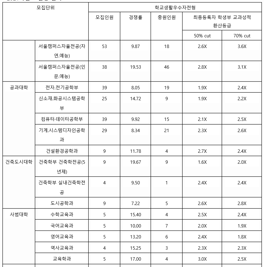 홍익대학교 2021학년도 교과 전형인 교과 우수자 전형 등급대입니다. 신소재, 화공시스템공학 1.7, 건축학부 건축학전공 1.7, 수학교육과 1.5, 역사교육과 1.7, 국어국문학 1.8, 미술대학 예술학과 1.6 등의 학과가 1등급대로 높은 교과 등급을 보여주고 있습니다. 1~2등급 대입니다. 학생부 종합전형인 학교생활 우수자 전형에서는 건축학 전공 2.0, 전자전기공학 2.4, 영어교육 1.8, 교육 2.5, 법학 2.2, 경제 2.7, 광고홍보학부 3.7 등입니다.