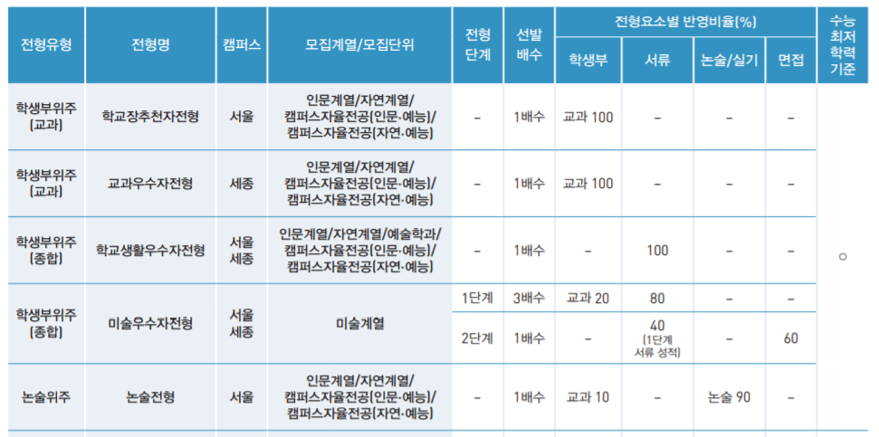 홍익대학교 주요 수시 전형으로는 학생부 교과 위주 학교장 추천자 전형(244명), 학생부 종합 학교생활우수자 전형(542명), 논술위주 논술 전형(389명) 등이 있습니다. 홍익대는 모든 주요 수시전형에서 수능최저학력기준을 적용하고 있습니다. 서울캠퍼스 기준으로 인문계열/예술학과/ 캠퍼스자율전공(인문·예능) 국어, 수학, 영어, 탐구(사회/과학) 영역 중 3개 영역 등급 합 7 이내, 한국사 4등급 이내이며, 자연계열/ 캠퍼스자율전공(자연·예능) 국어, 수학(미적분/기하), 영어, 탐구(과학) 영역 중 3개 영역 등급 합 8 이내입니다. 학생부 종합 전형은 자기소개서 제출 필수입니다. 전형요소 반영비율은 학생부 교과 전형 교과 100%, 학생부 종합 서류 100%, 논술 전형 논술 90%, 교과 10%입니다. 홍익대 수시 원서 모집은 9월 10일부터 14일까지입니다.