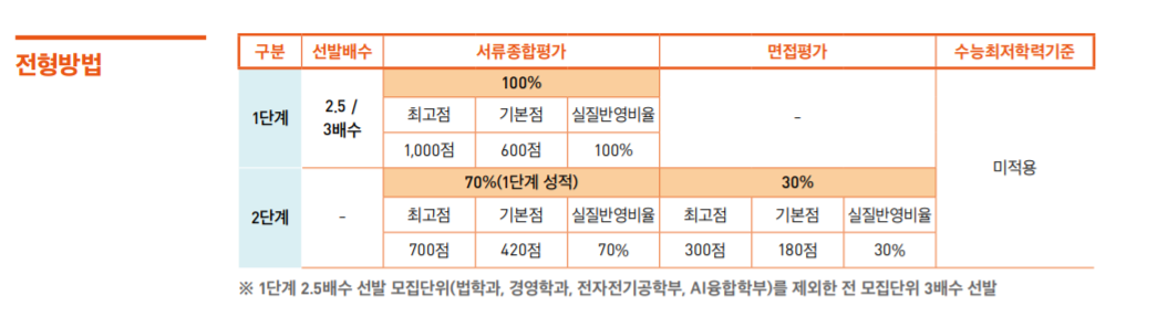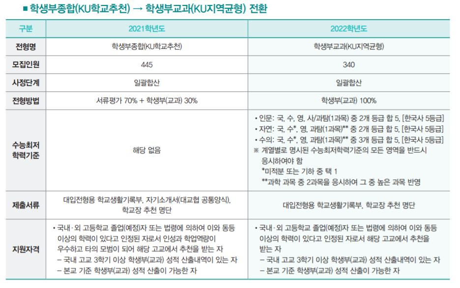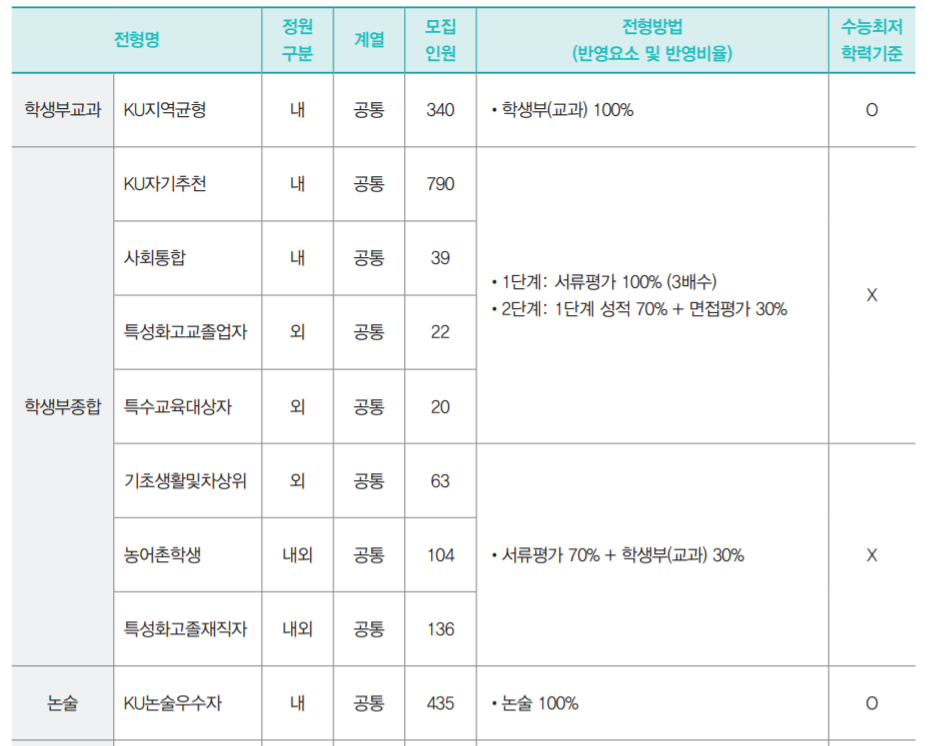 주요 전형으로는 학생부 종합 KU학교추천에서 학생부교과전형으로 변경한 KU지역균형 선발 340명, 학생부종합 KU자기추천 790명, KU논술우수자 435명 등이 있습니다. 학생부 교과 KU지역균형은 학생부 교과 100% 반영이며 수능최저학력기준을 적용합니다. 인문계는 국, 수, 영, 사/과탐(1과목) 중 2개 등급 합 5, 자연계 국, 수, 영, 과탐(1과목 중 2개 등급 합 5, 수의예 국, 수, 영, 과탐(1과목) 중 3개 등급 합 5입니다. 전 계열 한국사는 5등급 이상입니다. 학생부종합 KU자기추천은 1단계 서류평가 100% (3배수), 2단계에서 1단계 성적 70% + 면접평가 30% 반영입니다. 수능최저학력기준은 없습니다. 제출 서류는 입학원서, 학교생활기록부, 자기소개서입니다. 논술우수자 전형은 논술 100%로 선발하며 인문계 국, 수, 영, 사/과탐(1과목) 중 2개 등급 합 4, 자연계 국, 수, 영, 과탐(1과목) 중 2개 등급 합 5입니다. 건국대 원서접수 일정은 9월 10일부터 14일까지입니다.