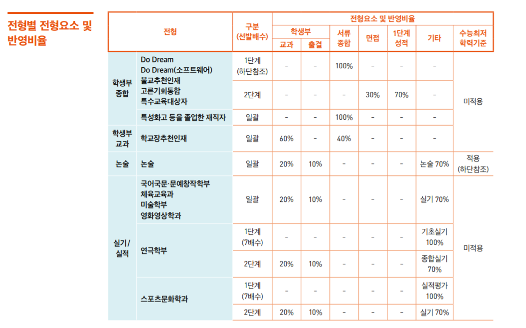 동국대는 2022년도 전형에서 수시모집 인원이 축소되어 지난해 2,103명에서 1,880명을 모집합니다. 비율은 59.9%입니다. 정시모집은 40.1%입니다. 수시모집 원서 접수기간은 9월 10일부터 14일까지입니다. 주요 전형으로 학생부 종합 Do Dream 473명, 학생부 교과 학교장 추천 인재 409명, 논술 우수자 350명을 선발할 예정입니다. 전형요소 반영비율을 보면 학생부 종합은 1단계 서류 100%, 2단계 면접 30%, 1단계 성적 70%, 학생부 교과는 교과 성적 60%, 서류 40%이며 두 전형은 수능최저학력기준이 없습니다. 논술 전형은 논술 성적 70%, 교과 20%, 출결 10% 반영, 인문계열 국어/수학/영어/탐구(사회 또는 과학) 중 2개 영역 등급 합 4등급 이내, 한국사 4등급 이내, 자연계열 국어/수학/ 영어/ 과학탐구 중 2개 영역 등급 합 5등급 이내, 한국사 4등급 이내의 수능 최저학력기준을 적용합니다. 경찰행정학부는 국어/수학/영어 중 2개 영역 등급 합 4등급 이내, 한국사 4등급 이내를 적용합니다.