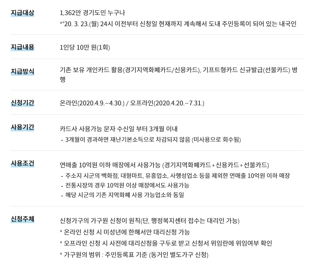 재난기본소득의 개념으로 지원될 경기도의 재난긴급생활비는 관내에 거주하는 전 도민에게 지원될 예정입니다. 지급 내용은 3월 24일 24시 이전부터 신청일까지 경기도내 주민 등록이 되어 있는 내국인 대상입니다. 외국인은 대상이 아닙니다. 지원되는 금액은 1인당 10만원으로 1회한 지급됩니다. 인당 기준이니 3인 식구라면 30만원을 받을 수 있는 셈입니다. 지급되는 생활비는 현금으로 제공되는 것이 아니라 경기도에서 사용되고 있는 지역화폐카드 또는 개인 신용카드, 신규로 발급되는 선불카드를 이용하여 금액이 충전되어 사용할 수 있게 됩니다.