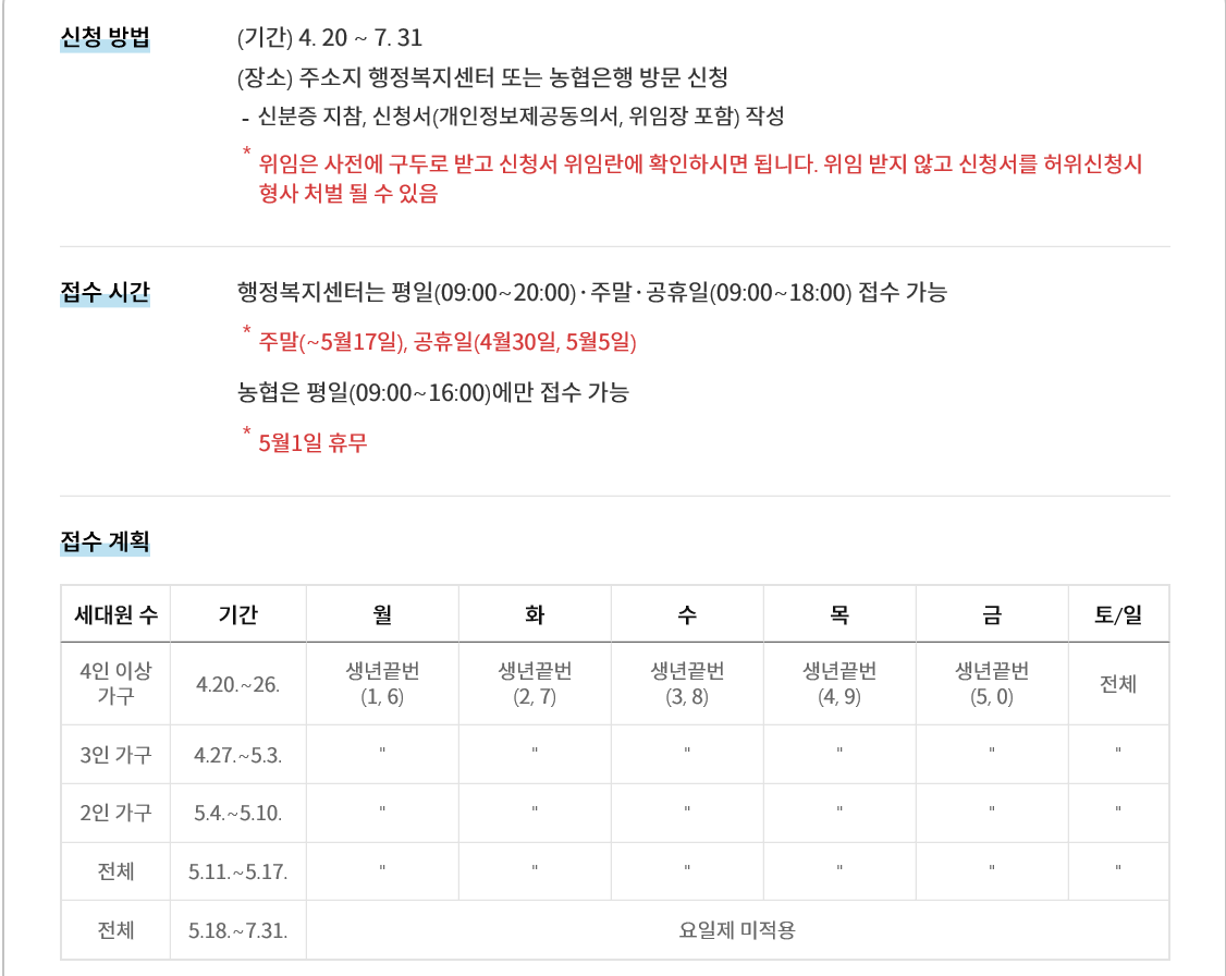 오프라인으로는 기프트형 선불카드를 만들어 사용하는 것으로 4월 20일부터 7월 31까지 거주지역 행정복지센터 또는 농협은행을 직접 방문하여 신청하면 됩니다. 신분증 지참이 필요하며 신청 서류 작성을 하면 되겠습니다. 세대원 4인 가구 이상은 공적마스크 구입 방식으로 생년에 따라 차등 방문을 하도록 하였습니다. 신청일이 지나면 선불카드 지급은 되지 않으니 반드시 기한내 방문이 필요합니다.