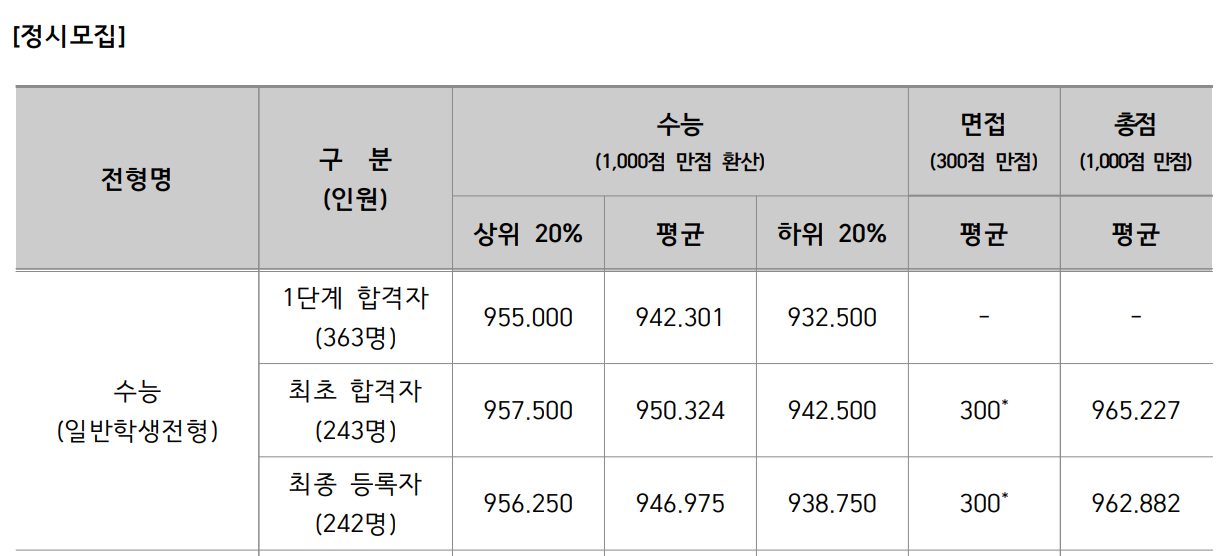 정시 합격대 점수는 정확히 알기는 어렵지만 배치표 등을 참고하면 국어, 수학, 탐구 백분위 점수 274~280점, 백분위 91~93점 수준으로 1등급 후반, 2등급 초반대로 예상됩니다.