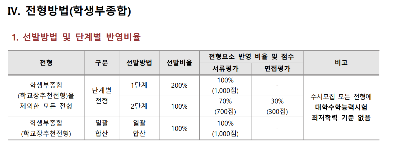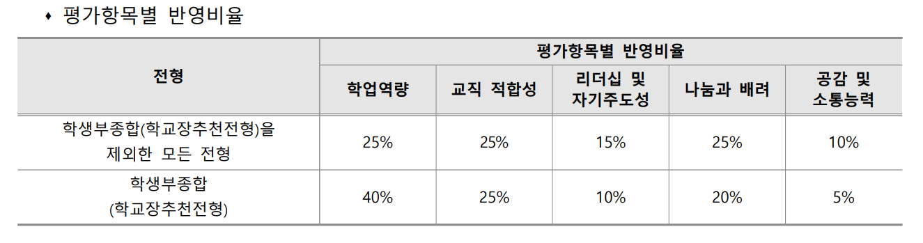 주요 전형인 학생부종합(교직적성전형), 학생부종합(학교장추천전형)에 대하여 살펴 보겠습니다. 교직적성전형은 학교생활기록부 제출이 필요하며 1단계 서류 심사로 200% 선발, 2단계에서 1단계 성적 70%, 면접 30% 비율로 선발합니다. 학업역량, 교직 적합성 및 잠재력, 교직인성 등을 정성적이고 종합적으로 평가합니다. 학업역량 25%, 교직 적합성 25%, 나눔과 배려 25% 비율입니다. 학교 생활기록부 교과 영역도 관리가 잘 되어 있어야 합니다. 학교장 추천전형은 면접은 실시하지 않으며 일괄 합산 방식으로 서류 평가로 선발하며 학업역량 비중이 40%로 교과 평가 항목이 높습니다. 경인교대 모든 수시 전형에서 수능최저학력기준은 적용하지 않습니다.
