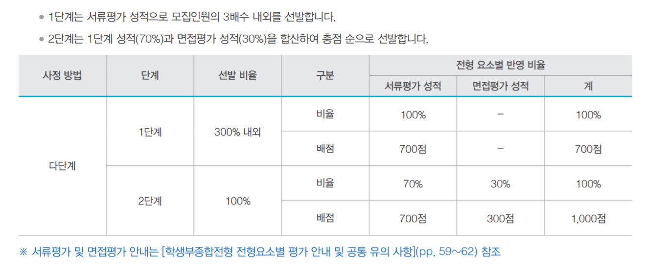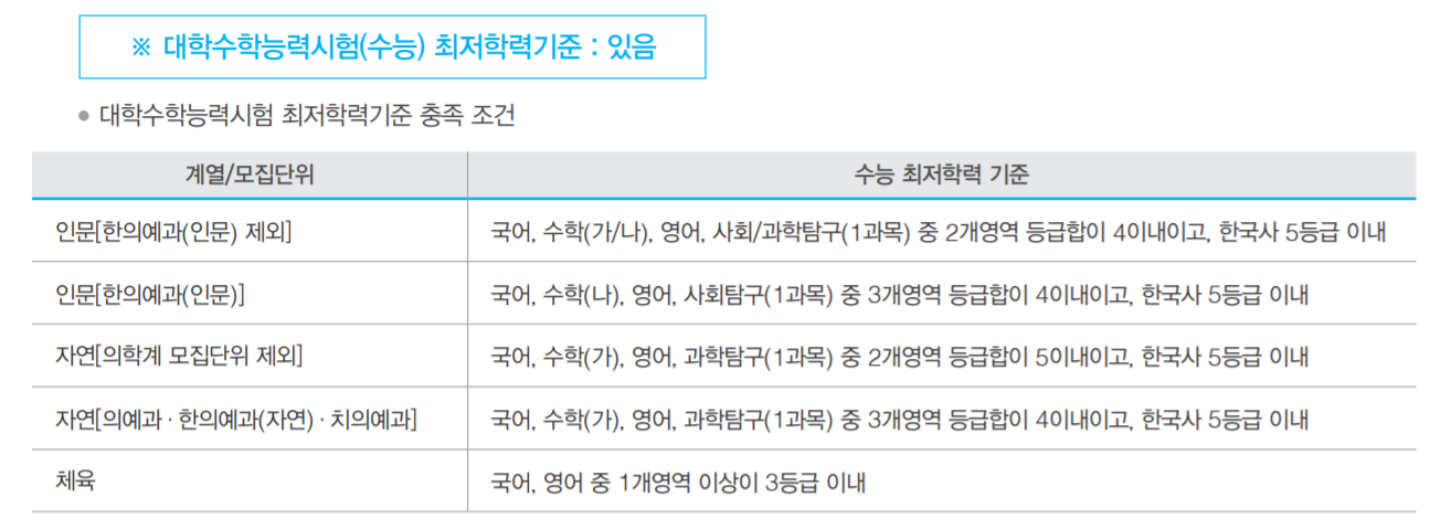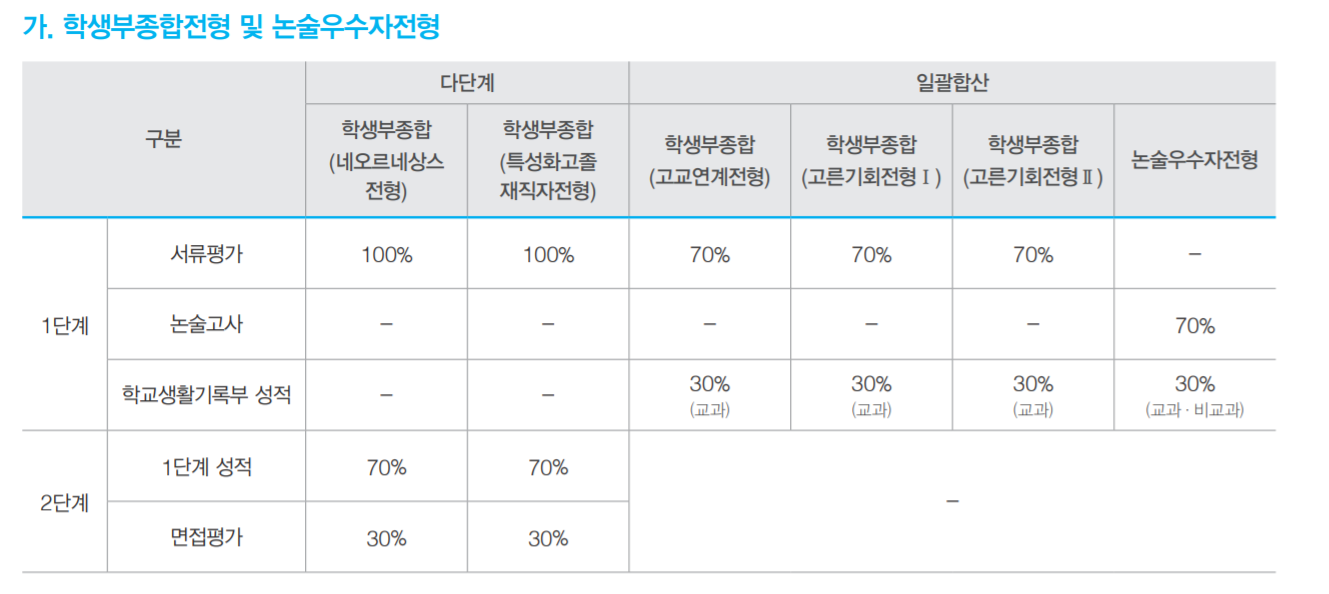 논술우수자 전형은 유일하게 수능최저학력기준이 있습니다. 논술 70%, 학교생활기록부 교과, 비교과 30%를 정량 평가하는 방식입니다.
