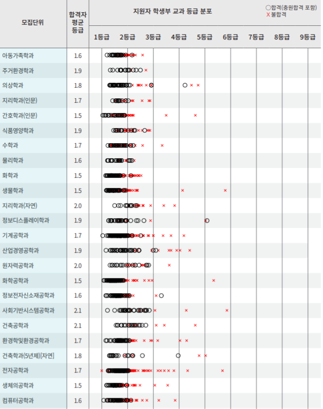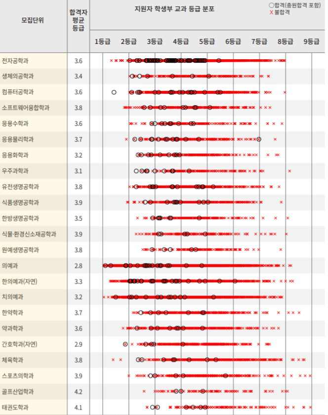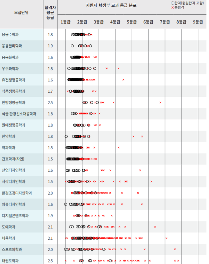 교과 성적이 평가되는 고교연계전형은 일부 학과를 제외하면 거의 모든 전공의 평균 등급은 1등급 이내입니다. 주요 학과를 보면 정치외교학과 1.4, 행정학과 1.6, 경제학과 1.6, 국문과 1.6, 영문과 1.6, 간호 1.5, 화학 1.5, 건축공학과 2.1등급 등입니다. 예체능계 체육학과는 2.1, 태권도학과는 2.5등급입니다. 논술우수자 전형의 경우 합격자 평균 등급은 3.1~4.2등급으로 분포되어 있습니다.