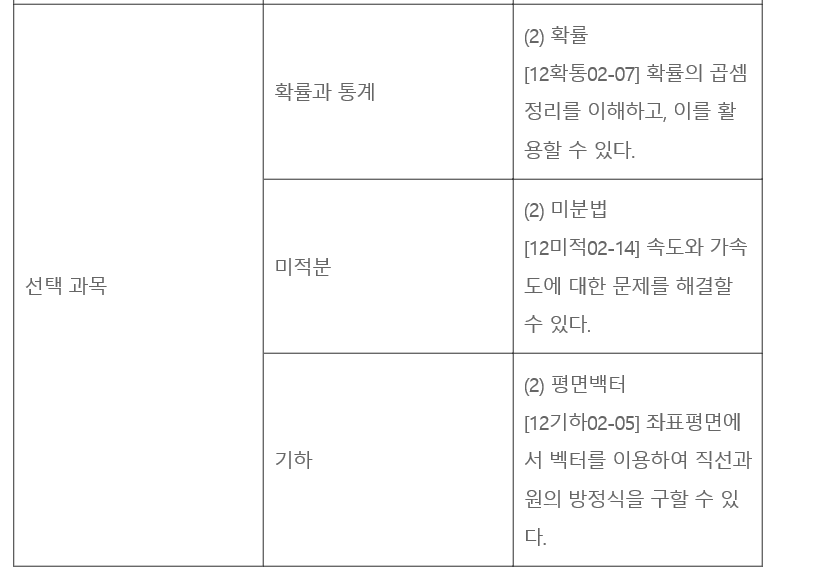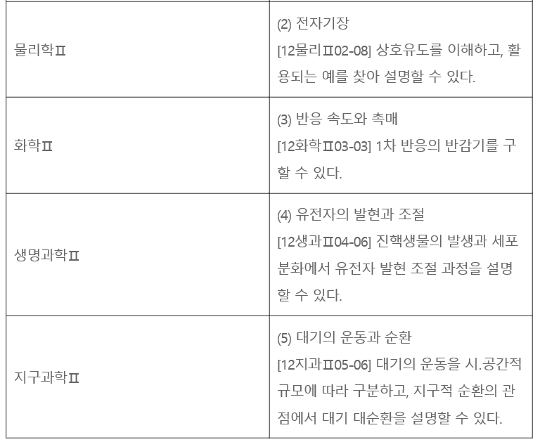 수학의 경우 수학 1,2는 전 범위이며 선택과목만 범위가 주어집니다. 확률과 통계는 확률 (12확통-02-07) 확률의 곱셈정리를 이해하고 이를 활용할 수 있다, 미적분은 (12미적-02-14) 속도와 가속도에 대한 문제 해결, 기하는 평면벡터(12기하-02-05) 좌표 평면에서 벡터를 이용하여 직선과 원의 방정식 구하기 등입니다. 과학탐구는 물리학II, 화학II, 생명과학II, 지구과학II 과목들이 시험범위가 있으니 참고하시기 바랍니다.